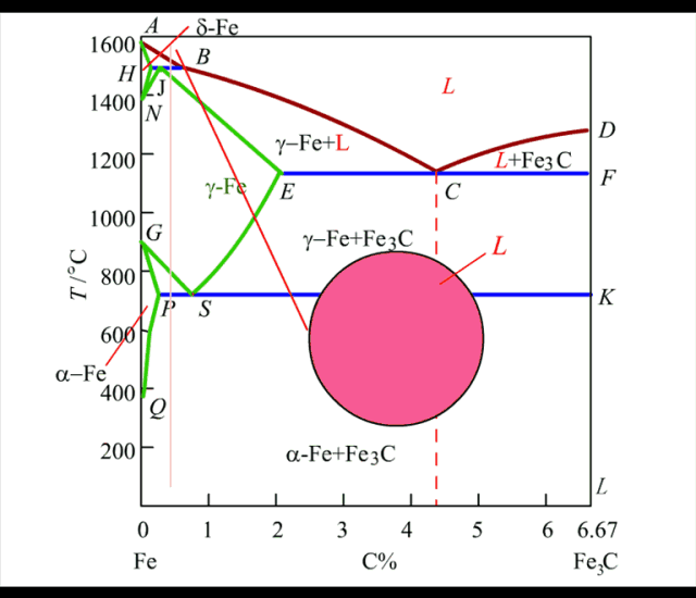 铁碳相图基础篇 Fe-C合金相图实际上是Fe-Fe3C相图,铁碳合金的基本组元也应该是纯铁和Fe3C。 铁碳合金相图是研究铁碳合金的工具,是研究碳钢和铸铁成分、温度、组织和性能之间关系的理论基础,也是制定各种热加工工艺的依据。 1、Fe-C相图中重要的点 2、Fe-C相图中重要的线 3、Fe-C合金平衡结晶过程 Fe-Fe3C相图中的相: Ⅳ、过共析钢(0.77%<C%<2.11%) Ⅴ、共晶白口铁(C%=4.3%) Ⅵ、亚共晶白口铸铁(2.11%<C%<4.3%) Ⅶ、过共晶白口铸铁 (C%>4.3%) 是不是已经凌乱了,不要急,咱们再从下面这个角度继续推演这个过程: 铁碳相图可视篇 Fe—C二元真乾坤 铁碳相图中的相有: 铁素体:碳溶解于α-Fe中形成的固溶体,用α 或 F 表示; 高温铁素体(δ-铁素体) :由于δ-Fe是高温相,因此碳溶解于δ-Fe中形成的固溶体也称为高温铁素体,用δ 表示 奥氏体:碳溶解于g-Fe中形成的固溶体,用g 或A 表示 渗碳体:铁和碳形成的化合物,含碳量为6.69%,用Fe3C或Cm表示 铁碳相图中的组织: 珠光体:共析转变的产物,是a 与Fe3C的机械混合物,用P表示。 莱氏体:共晶转变的产物是奥氏体与渗碳体的机械混合物,用符号Ld 表示。 低温莱氏体:这种由P与Fe3C组成的共晶体称,用Le’表示 此外还有Fe3CⅠ、Fe3C Ⅱ、Fe3CⅢ以及Fe3C(共析渗碳体) 组织及相组成计算 接下来让我们们看一下含碳量不同的液相的析晶过程: C%很低 亚共析 共析 过共析 亚共晶 共晶 过共晶 铁碳相图升华篇 奥氏体:碳与合金元素溶解在γ-Fe中的固溶体,仍保持γ-Fe的面心立方晶格 特征:奥氏体塑性很好,强度较低,具有一定韧性,不具有铁磁性 ▼ 铁素体:碳与合金元素溶解在a-Fe中的固溶体,具有体心立方晶格,溶碳能力极差; 特征:具有良好的韧性和塑性;呈明亮的多边形晶粒组织; ▼ 马氏体:碳溶于α-Fe的过饱和的固溶体,体心正方结构; 常见的马氏体形态:板条、片状; 板条马氏体:在低、中碳钢及不锈钢中形成,由许多成群的、相互平行排列的板条所组成的板条束。空间形状是扁条状的,一个奥氏体晶粒可转变成几个板条束(通常3到5个); ▼ 片状马氏体(针状马氏体):常见于高、中碳钢及高Ni的Fe-Ni合金中;当最大尺寸的马氏体片小到光学显微镜无法分辨时,便称为隐晶马氏体。在生产中正常淬火得到的马氏体,一般都是隐晶马氏体。 ▼ 回火马氏体:低温(150~250oC)回火产生的过饱和程度较低的马氏体和极细的碳化物共同组成的组织。 这种组织极易受腐蚀,光学显微镜下呈暗黑色针状组织(保持淬火马氏体位向),与下贝氏体很相似,只有在高倍电子显微镜下才能看到极细小的碳化物质点。 ▼ 渗碳体:碳与铁形成的一种化合物Fe3C;