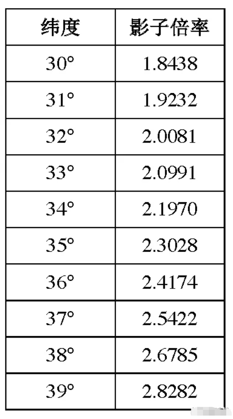 举个例子, 若某地的纬度为25°,根据表2,其影子倍率为1.5124。 经测量,前方阵列/遮挡物的高度为2m,则前后间距D=2m×1.5124=3.0248m, 实际工程可以向上取3.1m。 若某地的纬度为35.7°,根据表3,纬度为35°、36°时的影子倍率分别为2.3028、2.4174,利用插值法计算35.7°时的影子倍率分别为2.383. 经测量,前方阵列/遮挡物的高度为1.4m,则前后间距D=1.4m×2.383=3.336m, 实际工程可以向上取3.4m。