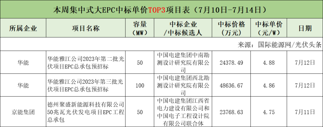 22个分布式大EPC项目,均价3.66元/W 9个集中式大EPC项目,均价4.23元/W 国际能源网/光伏头条(PV-2005)统计本周华能、华电、国家能源集团等企业发布了52个中标项目,总规模3235.47MW。其中,华能集团以757.77MW位列第一,中合信为尚义太阳能发电有限公司以600MW排名第二,华电集团以360.1MW位居第三。