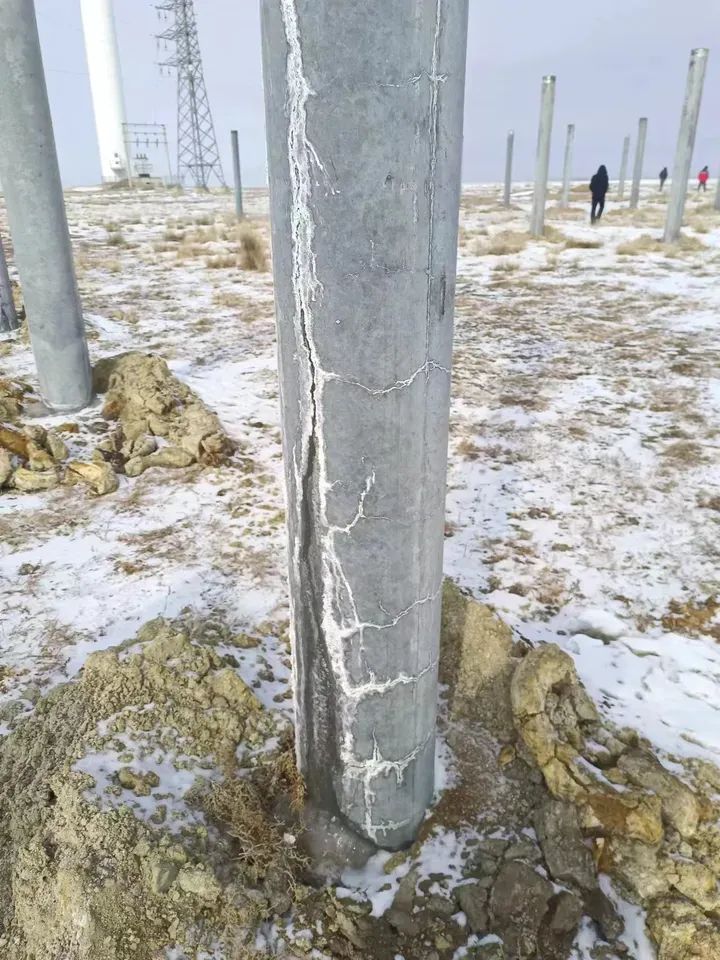 一、现场问题 张北某300MW风电项目出现管桩冻裂情况,桩身出现竖向裂缝,裂缝从地面处向上发展,部分开裂桩基出现渗水泛碱现象,如下图所示。 二、原因分析 ◆管桩裂缝 出现裂缝的桩基主要集中在地势相对较低区域,根据地勘报告,此区域地下水位相对较高。 经现场查看,出现裂缝的管桩内均有积水,伴随冬季温度下降,水凝结成冰,体积膨胀,产生9%体积膨胀,因此产生数千倍于混凝土抗拉强度的应力,该应力大于预应力管桩桩身抗拉强度,会引起桩基混凝土开裂。 由此推定,裂缝形成原因为:桩内水凝结成冰,发生体积膨胀,引起混凝土管桩开裂。 冻胀时,冷冻面以下土体内的地下水通过毛细作用持续向冻结面补给凝结,使冻害加剧。 ◆白色泛碱 混凝土返碱,也称为泛碱,是一种常见现象,主要发生在使用普通硅酸盐水泥的混凝土结构上。 这种现象是由于混凝土中氢氧化钙(Ca(OH)2)等碱性物质与空气中的二氧化碳反应,形成不易溶于水的白色碳酸钙(CaCO3),这些白色粉末状晶体或硬块残留在混凝土表面,导致表面出现白色泛白、起皮或脱落的现象。 泛碱现象不仅影响混凝土结构外观,还可能加速混凝土中钢筋锈蚀,影响结构安全性、耐久性。 白色泛碱产生原因:管桩存在裂缝,水与混凝土中水泥反应,产生硅酸盐结晶物经裂缝析出。 三、处理方案 ◆开孔排水 打孔排水,避免管桩内部积水冻结后体积膨胀。 管桩内充填水来自管外水位或管顶开口降雨/雪入渗,管内 充填土来自桩施工时在地面上拖拉时泥土进入桩 内以及施工时从桩底进入的土塞。 开孔方案:每根桩基采用水钻开设一个排水孔,孔径 8-12mm,开孔位 置应位于桩身东西侧(东西侧向阳,有利于排水)。排水孔距离地面约 150mm左右(高出内部土塞或灌实面即可),开孔应避开桩身钢筋。 此做法类似于变电站中钢管构架设计中预留排水口,高出内部灌浆面标高,目的就是排除钢管杆内部冷凝水,防止积水结冰后冻裂钢管杆。 桩顶加盖: 由于降雨也是管内积水的来源之 一,对于管桩顶部加混凝土或钢制防水桩帽进行封 闭即可阻止降雨入渗。 注:桩底加盖并不能完全防止孔内积水的存在,一方面存在冷凝水,另一方面施工中带入的地下水(黏土地质,管桩中积水不容易下渗) 因此,北方项目,应考虑桩体设置排水孔,避免管桩冻裂问题,特别是高地下水区域。 ◆裂缝处理 对裂缝宽度小于 2mm 的桩,采用环氧树脂型高分子防腐防水材料进行喷涂。 对裂缝宽度大于 2mm 桩采用高分子沥青软膏进行嵌缝处理。 对于较大的裂缝应采用钻孔压力注胶加固的方法。 对未见裂缝的桩采用聚合物防水涂料喷涂,防止微裂缝进水, 降低往复冻融条件下混凝土的含水率。 注:施工中打桩存在桩体损伤带来的微裂缝问题。 裂缝处理可有效提高混凝土耐久性,解决桩的耐久性问题。 ◆桩身加固 方案一:抱箍加固 裂缝进行处理后,采用抱箍加固,阻止裂缝进一步发展, 每根桩一般设置 3 个抱箍,如下图: 方案二:碳纤维加固 裂缝处理后,采用外包碳纤维加固。 裂缝处环向无间隔粘贴 300g/m²碳纤维布 3 层,沿裂缝外延伸长度≥500mm,搭接长度 ≥200mm。 ①底胶涂刷在桩体表面,满涂,然后黏贴碳纤维布。 ②第一层碳纤维布上再刷环氧树脂胶,再绕第二层... ③包一层布涂一层胶,一层层浸润,干后成为一个整体。 四、预防措施 在冻土地区的管桩,为防止出现冬季管桩的炸裂情况,两个措施很有必要。 ①管桩地面以上150mm左右(土塞面以上或灌实面以上)东西侧开孔8-12mm排水。 ②管桩内部和外部填充中粗砂,防止内外部冻胀情况。经现场试验验证(详见下文),内外部填砂后的管桩,能有效起到防冻作用。 光伏支架预制桩冻裂问题及解决方案 |