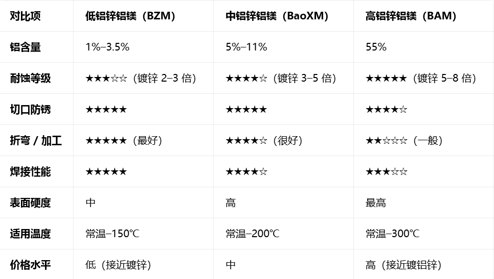 一、先懂本质:铝含量决定一切 锌铝镁 = 锌(Zn)+ 铝(Al)+ 镁(Mg) 三元合金镀层。铝含量是分水岭:铝越高,耐蚀越强、硬度越高,但成型 / 焊接越难;铝越低,越接近传统镀锌、加工越好、成本越低。 1. 低铝锌铝镁(BZM):镀锌升级版,性价比之王 成分:Al 1%–3.5% + Mg 1%–2% + 余量 Zn 定位:纯镀锌(Z)的耐蚀升级替代 耐蚀性:是普通镀锌的 2–3 倍 切口保护:极强(镁元素让切口快速生成致密保护膜,不易生锈) 加工性:最好(折弯、冲压、焊接接近镀锌板,不易开裂、掉镀层) 表面:细腻、锌花小、涂装附着力好 成本:最低(比普通镀锌略高,远低于中 / 高铝) 2. 中铝锌铝镁(BaoXM):全能平衡型,耐蚀 + 加工双优 成分:Al 5%–11%(主流 6%)+ Mg ~3% + 余量 Zn 定位:高耐蚀 + 良好加工 的黄金平衡点 耐蚀性:是普通镀锌的 3–5 倍 切口保护:超强(盐雾环境下切口几乎不扩锈) 加工性:良好(可折弯、辊压、轻度冲压,比高铝好很多) 硬度:高于低铝,耐磨、抗刮更好 成本:中等(高于低铝、低于高铝) 3. 高铝锌铝镁(BAM):顶级耐蚀,恶劣环境专用 成分:Al 55% + Mg 1%–3% + Si 1.6% + 少量 Zn 定位:镀铝锌(GL)的耐蚀超级升级版 耐蚀性:是普通镀锌的 5–8 倍,沿海 / 重腐蚀环境首选 切口保护:极强(镁大幅改善传统镀铝锌 “切口易锈” 致命缺点) 加工性:一般(硬度高、偏脆,大角度折弯易微裂,不适合深冲) 耐高温:优秀(300℃+ 稳定,适合高温屋面) 成本:最高(材料 + 工艺成本最贵) 二、三大核心性能对比(一眼看懂) 三、真实案例:三大系列在各行业的标杆应用 (一)低铝锌铝镁(BZM):普通环境 + 高加工首选 案例 1:小米汽车超级工厂(武汉) 应用部位:主厂房墙面围护系统、内部钢结构檩条 选材理由:工厂位于内陆普通大气环境,对折弯加工、焊接、安装精度要求极高。低铝锌铝镁加工性接近镀锌,折弯回弹量小,现场安装效率提升 18%,同时耐蚀性是普通镀锌的 2–3 倍。 效果:满足 50 年设计使用寿命,15–20 年无红锈,比传统镀锌板维护成本降低 60%。 案例 2:家电行业(美的、格力空调内机 / 风管) 应用部位:空调内机壳体、通风管道、电器柜外壳 选材理由:需要深冲压、复杂折弯、焊接 + 喷涂全流程加工。低铝锌铝镁冲压不开裂、焊点不腐蚀、涂装附着力强,表面细腻适合免喷涂或浅涂层。 效果:替代 “镀锌 + 喷涂” 工艺,省去喷涂工序、降低成本 30%,耐蚀寿命延长至 15 年以上。 案例 3:普通工业厂房、仓储物流中心 应用部位:屋面、墙面、檩条、次结构、设备外壳 选材理由:内陆 / 普通大气环境,性价比优先、加工便捷。低铝锌铝镁成本仅比镀锌高 5%–10%,但寿命翻倍。 效果:全国上千座标准厂房采用,15–20 年不生锈、不漏水,全生命周期成本比镀锌板低 20%。 (二)中铝锌铝镁(BaoXM):户外高耐蚀 + 平衡加工首选 案例 1:光伏支架(全国大型光伏电站) 应用部位:光伏固定 / 跟踪支架、支架立柱、横梁 选材理由:户外长期裸露、高盐雾 / 高紫外线、切口多、免维护要求。中铝锌铝镁切口自修复、耐盐雾 3000 小时 +,耐蚀是镀锌的 3–5 倍。 效果:头部光伏企业替代镀铝锌后,冲孔废品率从 3.7% 降至 0.9%,省去封边补漆工序,寿命延长至 25 年 +。 案例 2:光热发电项目(新疆、青海熔盐光热电站) 应用部位:光热集热支架、反射镜支撑结构 选材理由:西北沙漠高温、强紫外线、风沙腐蚀,要求免喷涂、高耐蚀、高强度。宝钢量身定制超宽规格中铝锌铝镁,耐候性达进口产品水平。 效果:国内光热行业首次应用,质保 30 年,替代进口材料、成本降低 25%。 案例 3:美的 / 格力空调外机底盘(免喷涂绿色方案) 应用部位:空调室外机金属底盘(长期户外雨淋、日晒、盐雾) 选材理由:冲压复杂、耐蚀严苛、免喷涂环保。中铝锌铝镁成形性最优、耐碱耐氨、耐刮擦,替代 “热镀锌 + 喷涂”。 效果:2023 年批量应用于美的、格力,减少 VOC 排放、降低成本、寿命提升至 20 年。 案例 4:畜牧养殖(规模化猪场 / 鸡场) 应用部位:猪舍板、鸡舍围护、料槽、通风设备 选材理由:高湿、高氨气、酸碱腐蚀(养殖环境腐蚀等级 C4–C5)。中铝锌铝镁耐氨气、耐酸碱、不积垢、易清洁。 效果:比普通镀锌板寿命延长 3 倍,5–8 年不生锈,减少养殖环境细菌滋生。 案例 5:沿海风电项目(湛江钢铁 — 华润电力风电场) 应用部位:风机塔筒附件、支架、沿海陆上风电结构 选材理由:沿海高盐雾、台风(70 米 / 秒)、强腐蚀环境。中铝锌铝镁耐盐雾 + 自修复 + 强韧性,平衡耐蚀与抗风强度。 效果:国内首个海上抗台机型应用于陆上风电标杆项目,25 年免维护。 (三)高铝锌铝镁(BAM):极端腐蚀 + 高温环境首选 案例 1:加勒比海岛建筑项目(安提瓜和巴布达) 应用部位:海岛民生建筑屋面、外墙(ISO C5-M 最高腐蚀等级) 选材理由:高温高湿(26–32℃)、盐雾极强、紫外线超强,普通材料 2–3 年锈穿。高铝锌铝镁 + 氟碳涂层耐盐雾 4000 小时、QUVA 老化 5000 小时。 效果:质保 25 年,抵御飓风 + 盐雾双重考验,中国高端彩涂首次进入加勒比极端腐蚀市场。 案例 2:沿海化工区、电厂、码头钢结构 应用部位:化工设备外壳、电厂烟囱附件、码头栈桥、海岛工程 选材理由:酸碱腐蚀、沿海盐雾、高温(200–300℃),传统镀铝锌切口易锈。高铝锌铝镁镁元素改善切口耐蚀、耐高温 300℃+。 效果:30 年 + 防腐寿命,比传统镀铝锌寿命提升 2–3 倍,几乎零维护。 案例 3:高端地标建筑(机场、高铁站、市政工程) 应用部位:机场航