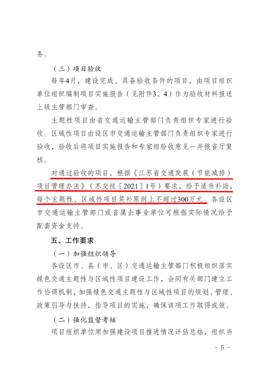 政策不但支持,还有补贴!江苏省交通运输厅下发了一则关于开展江苏省绿色交通项目建设工作的通知。通知要求,到2025年,建设完成10个绿色交通示范县(市、区)区域性项目,40个绿色交通主题性项目。 其中,通过相关部门和专家验收的项目,给予适当补助,每个主题性、区域性项目奖补原则上不超过300万元!